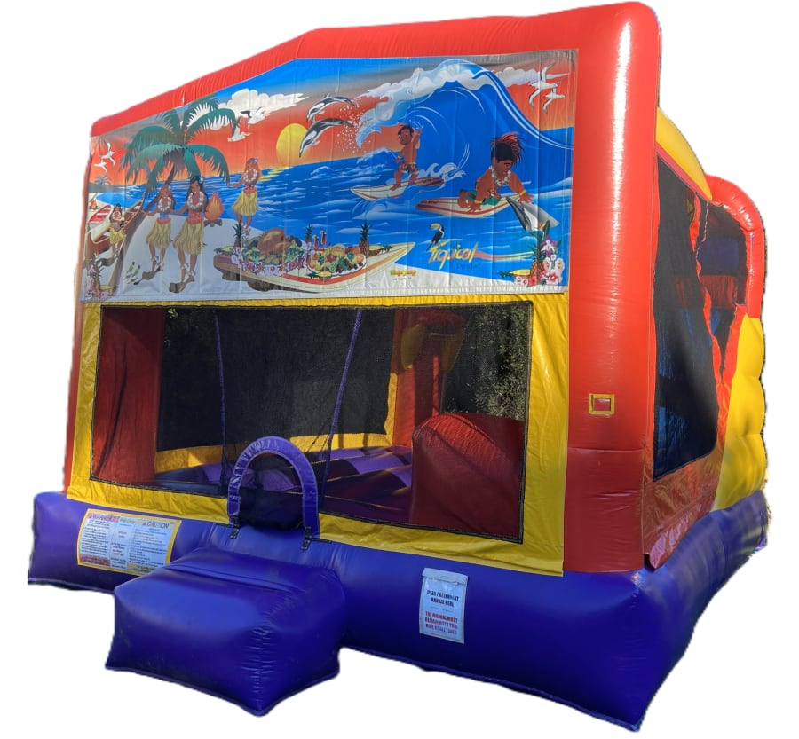 Are you looking to add a splash of excitement to your next event? The Tropical Paradise Combo 4.5 x 6 is the perfect choice for unforgettable celebrations! Specially designed for kids' parties, community gatherings, and special occasions, this vibrant jumping castle brings the fun of a tropical island right to your backyard. Featuring a large jumping area, an exhilarating slide, and a built-in basketball hoop, it promises hours of active play for children of all ages.